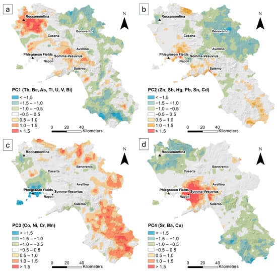 PC3 (Figure 4c), characterized by the association of Mn, Ni, Cr, and Co, accounts for 10.1% of the total variance. Scores greater than 1.0 are located along the western side of the region and in the southern sector, corresponding to the areas of the siliciclastic units. The remaining part of the territory is characterized by values between −0.5 and 0.5, with negative values (<−1.0) primarily located across the Phlegraean Fields and Ischia Island.