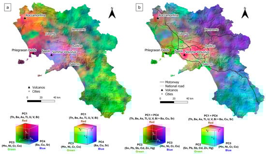 This chromatic approach enables the differentiation and highlighting of the distinct geochemical signatures of the components, offering a synoptic view of the natural processes occurring in the area and potential zones of overlap in geochemical signals [70,71]. Looking at Figure 5a, the PC1 signal (in red), mainly associated with soils developed from volcanic products of Roccamonfina, is prominently represented by the presence of the colour red, still in correspondence with the volcano. The PC4 signal (in blue), attributed to soils originating from the recent products of the Somma–Vesuvius complex, is limited to its volcano’s district, as shown in Figure 4d. The Phlegraean Fields area is marked by a purple hue, resulting from the overlap of the red and blue bands, which reflects the overlapping geochemical signals associated with PC1 and PC4, thereby making the signal in the Phlegraean area more discernible. The PC3 signal (green), associated with the geochemical signature of the soils derived from siliciclastic units, is predominantly localized across the southern and northwestern sectors. This would confirm again the strong correlation of elements such as Co, Mn, Ni, and Cr with these basin deposits.