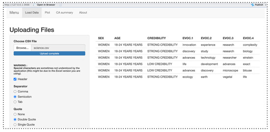 To use the FactoShinySR application for analyzing social representations, users must first download the application. A link to the application is provided in the Supplementary Materials. The application is an R script that can be run using software such as RStudio (version 2024) or directly through the R console. Once the application is running, users can proceed with importing data and conducting their analyses. Using FactoShinySR to analyze social representations begins with data import and preparation. Users can import data files in .csv format directly into the application. Once the file has been loaded, the interactive interface provides a preview of the data (see Figure 1), ensuring that the structure and quality of the data can be checked before analysis. This step is crucial to ensure that the variables are correctly identified and formatted for the correspondence factor analysis.