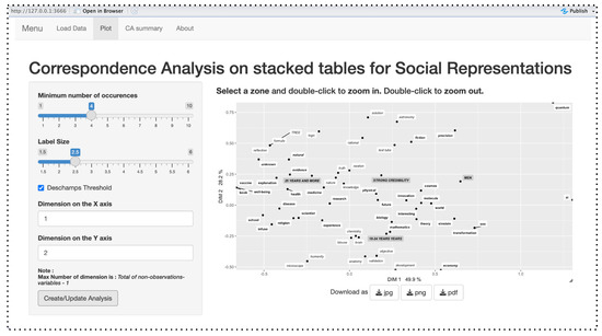 FactoShinySR offers advanced functions for visualizing results, enabling researchers to explore the structures of social representations through interactive, customizable graphs. Once the correspondence factor analysis has been carried out, the application generates a graph that represents the modalities of the variables along the main axes (see Figure 2). This graph highlights the relationships and contributions of the modalities, making it easier to interpret the data visually. Users can interact with the graph to adjust the display parameters, such as selecting the axes to be displayed, zooming in on certain sections, and highlighting significant modalities. The graph can be downloaded in JPG, PnG, and PDF formats.