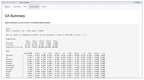 In addition to displaying contributions, FactoShinySR offers tools for exploring additional dimensions beyond the first two axes, enabling a more complete analysis of the data when relevant structures are hidden in less visible dimensions. In this way, users can navigate between different factorial planes and obtain complementary views for an in-depth understanding of the data. Finally, the ‘CA summary’ tab (see Figure 3) uses FactoMineR’s summary.ca function to display all the elements, summarizing the analysis (contributions, coordinates, and cosine squared).