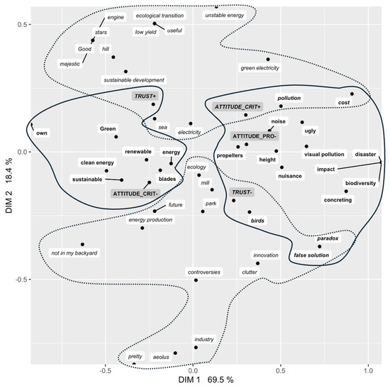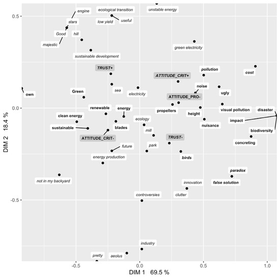 Some elements participate in both axes, reflecting complex and ambiguous dimensions. For example, the term “cost” or “disaster” reflects both concrete criticisms and perceived global impacts. Finally, the explanatory variables reinforce this structuring. ‘Attitude_Pro+’ and ‘Attitude_Crit+’ are positioned oppositely on Axis 1, reflecting a clear polarization between favorable and critical attitudes (Cumulative Contributions: 16.42% and 20.28%, respectively). Similarly, ‘Trust+’ (Axis 2 Contribution: 32.82%) and ‘Trust−’ (Axis 2 Contribution: 33.54%) mainly influence Axis 2, illustrating the central role of trust in shaping representations of wind turbines.