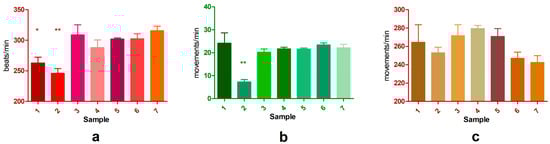 The physiological activity evaluation results. (a) Heart rate; (b) claw movement; (c) appendages movement. The columns represent average values, and the error bars represent the standard deviation; Statistical significance: p values between 0.01 and 0.05 are marked with *, and p values between 0.001 and 0.01 with **, based on Tukey’s post-hoc test. All comparisons were made against the control group. Groups 1–7: 1—SXS; 2—DMBA; 3—DMF; 4—GLY; 5—PDO; 6—DMSO; 7—control.