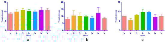 Average swimming speed of Daphnia magna measured at the initial time point (a), after 24 h of exposure (b), and after 48 h of exposure (c). Bars represent mean values; error bars indicate standard deviation (n = 3). Groups 1–7: 1—SXS; 2—DMBA; 3—DMF; 4—GLY; 5—PDO; 6—DMSO; 7—control.