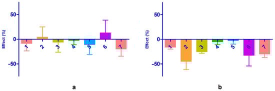 Effect on Daphnia magna swimming speed relative to the initial time point after 24 h (a) and 48 h (b). Bars represent mean values; error bars indicate standard deviation (n = 3). Groups 1–7: 1-SXS; 2-DMBA; 3-DMF; 4-GLY; 5-PDO; 6-DMSO; 7-control.