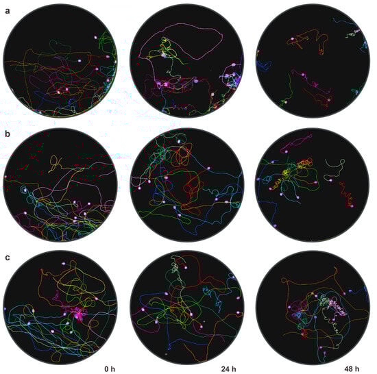 Sample paths of D. magna—one replicate from group 2 (a), group 6 (b), and group 7 (c) over the 48 h of exposure. The pink circles mark the end of the path. Each path was colored different.
