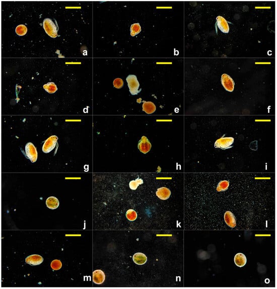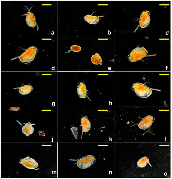 Daphnia magna embryonic development assay at 48 h of exposure (objective 10×). (a) SXS; (b) SBS; (c) PTS; (d) SBDS; (e) DMBA; (f) DENA; (g) DMU; (h) urea; (i) DMF; (j) DMSO; (k) Tween 20; (l) Tween 80; (m) SLS; (n) GLY; (o) PDO; scale bar = 500 µm.