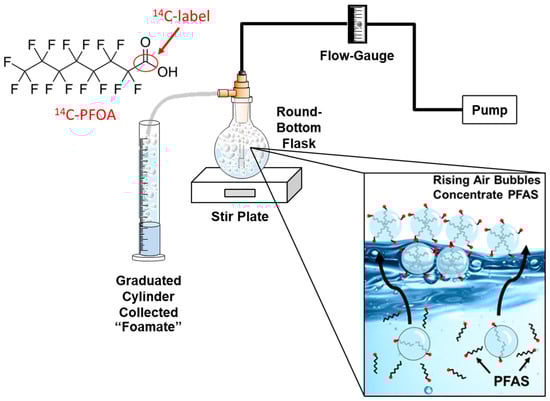 The results using our experimental setup (Figure 1) showed that, as the flow rate increased (4→8 L/min), the foamate volume increased and the 14C enrichment decreased (Table 2). The highest 14C recovered (91%) was at a flow rate of 8 L/min (Table 2). This flow rate is lower than that used by Dai et al. [], where increases in PFAS removal increased from 75% to 88% when the gas flow rate increased from 15 L/min to 30 L/min.
