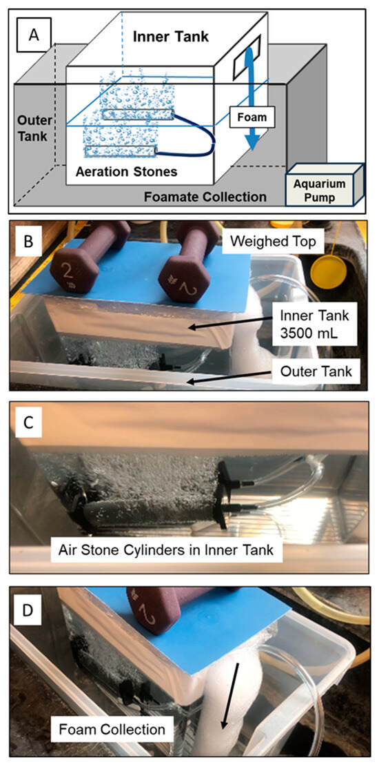 (A) Schematic of double tank setup; (B) experimental unit tank (3500 mL) inside larger tank with weighed top to force foam out the side; (C) close-up of aerated stone cylinders; (D) side view of foam cascading out of small tank into larger tank.
