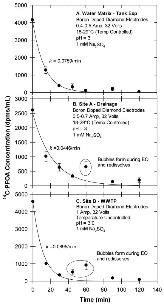 Radjenovic et al. [] indicated that the use of high PFAS concentrations (i.e., 10–100 mg/L) in laboratory experiments likely overestimates electrochemical oxidation performance and makes extrapolating results to environmentally relevant matrices difficult. As previously stated, the use of 14C-PFOA provided the advantage of making the analysis simple, quick, and negated any PFAS cross-contamination interferences. Moreover, by measuring the 14C activity of the foamate (dpms mL−1), converting to µCi, and then using the specific activity of the PFOA label (55 mCi mmol−1), the PFOA concentration could be calculated. In most tank experiments, the foamate had 14C-PFOA concentrations between 3000 and 5000 dpms mL−1, which would be equivalent to starting concentrations (Co) between 10 and 17 µg PFOA L−1, which would be environmentally relevant.