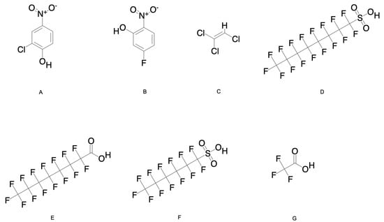 (A–G) Chemical structures of HNCs, TCE, and PFAS chemicals. Chemical structures created using chem draw, SDF files downloaded from PubChem, access date 5 March 2025.