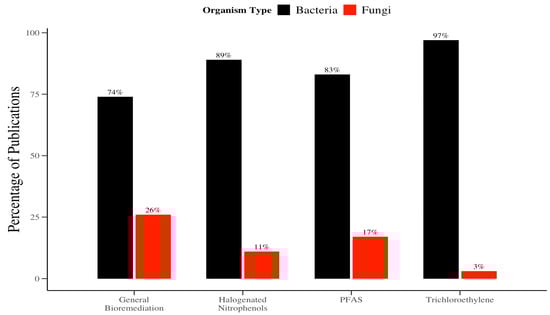 Despite these capabilities, mycodegradation remains significantly underexplored compared to bacterial approaches. This trend is evident in the distribution of biodegradation literature, where bacterial studies comprise 74% of the total (Figure 2). The dominance of bacterial research is even more produced in the remediation of specific organohalogen pollutants: bacterial-focused studies account for 89% of the literature on halogenated nitrophenol (HNCs), 97% on TCE, and 83% on PFAS (Figure 2). However, fungi have demonstrated the ability to tolerate and degrade higher concentrations of these persistent pollutants, often outperforming bacteria under similar conditions [].