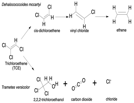 - Marco-Urrea, E.; Gabarrell, X.; Caminal, G.; Vicent, T.; Adinarayana Reddy, C. Aerobic degradation by white-rot fungi of trichloroethylene (TCE) and mixtures of TCE and perchloroethylene (PCE). J. Chem. Technol. Biotechnol. Int. Res. Process Environ. Clean Technol. 2008, 83, 1190–1196. [Google Scholar] [CrossRef]