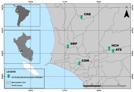 Map with study area and locations of the Lima air quality monitoring stations: Ate (ATE), Campo de Marte (CDM), Carabayllo (CRB), Huachipa (HCH), and San Martin de Porres (SMP). Scale 1 cm/7 km.