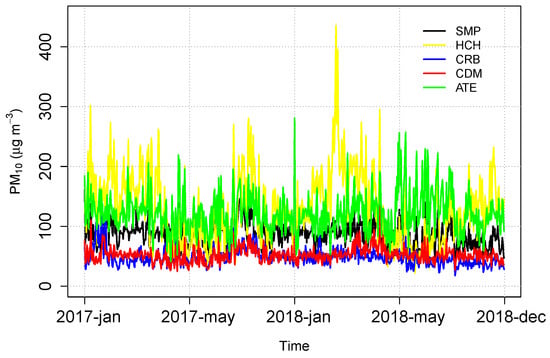 According to [,], one of the methods that allows the modeling of suspended xenobiotics is the spatial and temporal analysis of the effects of PM10, as well as the influence of meteorological variables such as temperature and wind on air quality. In [], authors highlight that the understanding of these particles, due to their size, is worrying, especially due to their levels of permanence and invasion in the respiratory tract. In this context, ref. [] makes favorable predictions through singular spectral analysis. This approach is considered a reliable stochastic process to draw a spatiotemporal visualization of PM10, a pollutant with a great impact on exposed populations.