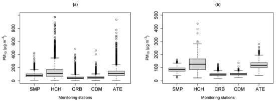 Boxplots of hourly (a) and daily (b) PM10 concentrations at five monitoring stations located in Peru. This figure presents a comparative analysis of PM10 levels recorded at stations SMP, HCH, CRB, CDM, and ATE. In panel (a), the boxplots reflect the distribution of hourly concentrations, revealing high temporal variability and the presence of numerous outliers, especially at HCH and SMP, suggesting specific episodes of intense pollution. In panel (b), the data aggregated at the daily level show a more contained dispersion, although high maximum values are still observed at some stations, again highlighting HCH and SMP as critical areas. This type of visualization makes it possible to identify differences in pollution patterns between stations, which is key to establishing local air quality management strategies.