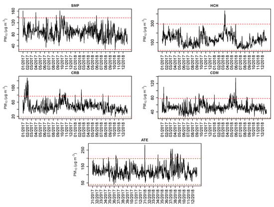 Figure 2 shows the PM10 concentration trajectory of the monitoring station in Peru. The HCH station presented the highest PM10 concentration followed by the ATE station. On the other hand, the CDM station had the lowest daily PM10 concentration rates (Figure 3). The highest daily PM10 concentration value occurred in April 2018 at the HCH meteorological station. Figure 3 shows the boxplot graph for the hourly and daily PM10 data. It can be seen in this figure that both data sets have discrepant observations. Figure 4 shows the daily time series of PM10 and the boundaries of the boxplot. This figure shows that the outliers occur in different months of the year.