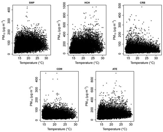 Scatterplot between temperature and PM10 at each meteorological station (SMP, HCH, CRB, CDM, ATE) in Peru.