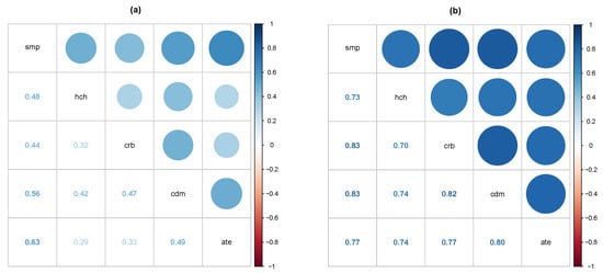 Table 1 provides the main statistical measures of daily PM10 concentration for meteorological stations considered in this study. It can be seen in this table that the HCH station has the highest average concentration of PM10 and also greater variability, and the ATE station has the lowest average PM10. Hourly temperature and PM10 data at each station analyzed did not present a correlation (Figure 5). The HCH station presented the highest correlation between stations, being approximately 0.4, still a low value. Figure 6a presents the spatial correlation between weather stations considered in Peru. This figure shows that the highest correlation (0.63) occurred between the SMP and ATE stations. On the other hand, the spatial correlation between monitoring stations for the temperature variable is greater than 0.70 (Figure 6b). Therefore, there is a low spatial correlation between some air quality monitoring stations for variable PM10 compared to the temperature variable.