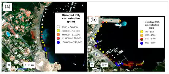 Dissolved CO2 concentration measurements in (a) Baia di Levante, Site A1; and (b) Porto di Levante, Site A2. (Base map sources: Esri, Maxar, Earthstar Geographics).