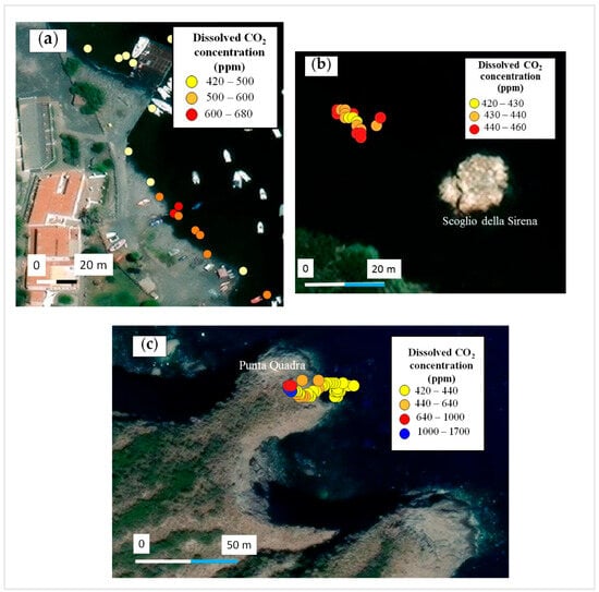 Dissolved CO2 concentration measurements in (a) the northwestern sector, Site B; (b) Scoglio della Sirena, Site C; and (c) Punta Cava, Site D. (Base map source: Esri, Maxar, Earthstar Geographics).