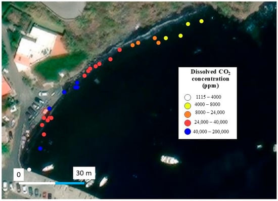 Measurements of the dissolved CO2 concentration were conducted in five areas: two in the northern sector, two along the eastern coast, and a final site in the southern sector (Figure 1). We measured the dissolved CO2 concentrations both in areas with minimal or no visible hydrothermal activity and in areas with evident hydrothermal activity with gas-rich vent bubbling.