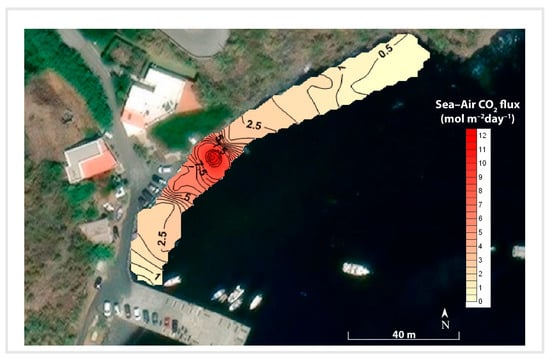 The results of dissolved the CO2 concentrations revealed areas with significantly elevated levels, particularly in the northeastern sector of the island (Site A) and the southern sector (Site E). For these sites, it is of particular interest to estimate the CO2 emitted diffusely from the sea surface into the atmosphere (sea–air CO2 flux).