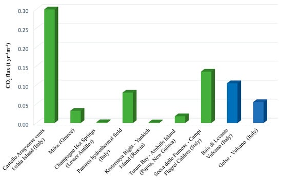 Finally, in the Gelso area, located in the southern sector of the island (Figure 6), we recorded a mean sea–air CO2 flux of 3 mol m−2 d−1, comparable to that observed at Baia di Levante. This corresponds to a flux of 132 g m−2 d−1, which is about twice the average CO2 flux typically reported for soil CO2 emissions on the lower flanks of the La Fossa cone and in the inhabited area of the Vulcano Porto area [,].