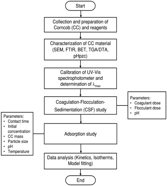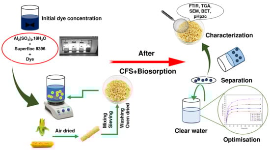 This study aims to evaluate the efficiency of combining the coagulation–flocculation–sedimentation (CFS) method with the adsorption process using corncob (CC), as a low-cost biosorbent, to remove dyes from synthetic aqueous solutions. CC (corncob), an abundant agricultural waste material in Algeria, is rich in lignin and cellulose. From aqueous solutions, this biomaterial has been assessed for its ability to remove anionic, cationic, and azo dyes from aqueous solutions [,,]. In this context, this research investigates the efficiency of using CC as a biosorbent for textile dye removal after the CFS process. The integration of these methodologies seeks to enhance the efficacy of dye removal by leveraging the advantages inherent in both techniques (refer to Scheme 1).