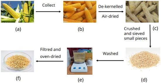 Graphical abstract of CCs’ collection and preparation. (a) Corncobs in a plantation, (b) corncob fruit after threshing and collection, (c) corncobs after air drying and grain separation, (d) corncobs after crushing and sieving, (e) corncobs during washing, (f) corncobs after preparation.