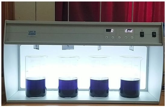 The coagulation–flocculation sedimentation process was conducted following the Jar-Test procedure using a VELP flocculator, as shown in Figure 3. A 500 mL sample was introduced into a 1 L tall beaker following this procedure. The process involved a four-station flocculation system, with each station having different rotational speeds ranging from 0 to 300 rpm. The device measured and digitally displayed these rotation rates and timings.