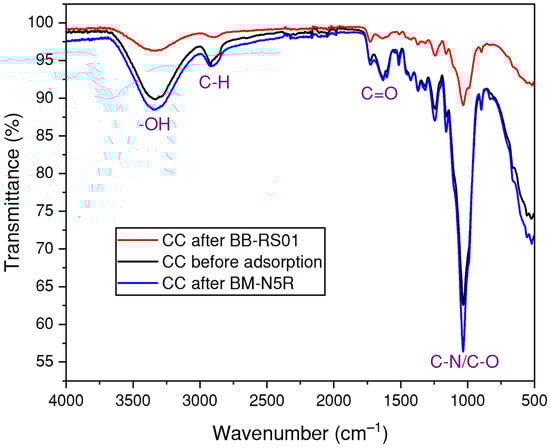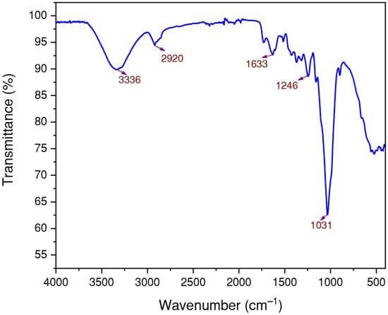 Figure 4 displays the Fourier Transform Infrared (FTIR) spectrum of corncob (CC) before adsorption, indicating various absorption peaks. The significant and pronounced band at 3336 cm−1 is attributed to the stretching vibrations of -OH and -NH groups. Furthermore, the asymmetric and symmetric C–H bands are detected at 2920 cm−1 and 2850 cm−1, respectively. A band related to the ester group in hemicellulose appears around 1633 cm−1, indicating a C=O stretching vibration. Peaks at 1246 cm−1 and 1031 cm−1 are associated with C–N stretching of amino groups and C–O vibrations of carboxylic acids, respectively. These findings align with previous research in the literature [,,,,,,].