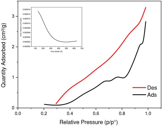 Figure 6 shows the nitrogen adsorption–desorption isotherms of the corncob. According to the Brunauer–Emmett–Teller (BET) classification, physisorption isotherms are typically divided into six distinct types. The isotherms of the CC predominantly correspond to types II and IV, as defined by the International Union of Pure and Applied Chemistry (IUPAC). This suggests the presence of mesopores (type IV) with a portion of macropores (type II), as shown by the presence of a hysteresis loop []. The pore size distribution, obtained from the adsorption route of the isotherm is shown in the inset of Figure 6. The CC sample demonstrates a wide range of pore sizes, ranging from mesopores (with diameters between 17 Å and 3000 Å) to macropores (with diameters exceeding >500 Å). Furthermore, the BET analysis indicates that the sample has a specific surface area of 0.4127 m2/g and an average pore diameter of 134.34 Å confirming its mesoporous nature [].