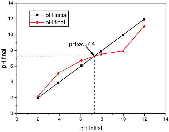 The pHpzc was determined using the batch equilibrium method. In this method, 50 mL of 0.01 M NaCl solution was adjusted to different initial pH values ranging from 2 to 12. After that, a known mass of biosorbent was added to the solution. The suspensions were agitated for 24 h at 25 ± 2 °C. The final pH was measured using a calibrated pH meter (model: CONSORT), and the ΔpH values were calculated accordingly. The pHpzc value was obtained from the plot of final pH versus initial pH (Figure 7), where the point of intersection between the curve ΔpH = 0 and the experimental curve indicates the pHpzc.
