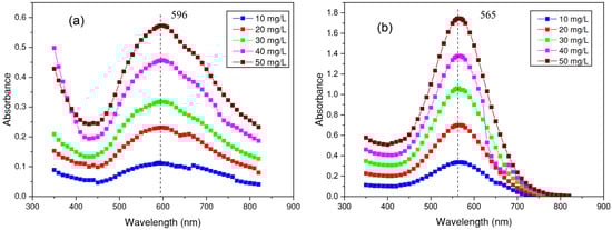 Absorbance = f (λmax) curves for various dye concentrations (a) BB-RS01; (b) BM-N5R.