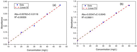Figure 8 illustrates absorbance curves as a function of various wavelengths for two studied dyes, BB-RS01 (a) and BM-N5R (b), across five different concentrations ranging from 10 to 50 mg/L.