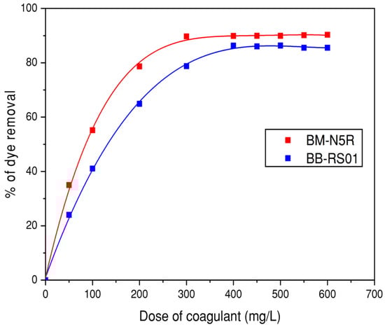 According to our obtained results (Figure 10), the optimal coagulant dose for BM-N5R was found to be 300 mg/L, resulting in a dye concentration of 48.42 mg/L. For BB-RS01, the optimal dose was 400 mg/L, corresponding to a residual dye concentration of 70 mg/L. The percentage of dye removed increased proportionally with a higher coagulant dose, reaching a peak at the optimal coagulant dose. Conversely, exceeding this optimal coagulant amount resulted in decreased dye removal efficiency. Chemical injection and the quick dispersion of the coagulant induce the agglomeration of dye particles and facilitate their decantation [].