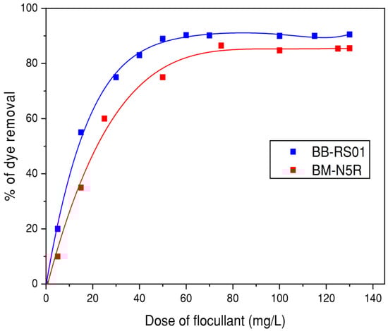 Figure 11 illustrates the effect of different flocculant dosages (ranging from 30 to 125 mg/L) on dye elimination. It is important to note that the coagulant dosages were maintained as constant at the previously determined optimal values of 300 mg/L for BM-N5R and 400 mg/L for BB-RS01, as demonstrated in Figure 10, throughout the duration of this trial.