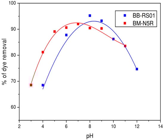 Our results indicate a significant increase in dye removal efficiency within the pH range of 2 to 12. The removal efficiency of BB-RS01 peaked at pH 8, achieving a 95.1% of dye elimination with a final dye concentration of 25 mg/L. In contrast, BM-N5R showed maximum removal efficiency starting at pH 6 and reaching its peak at pH 6.5 with a removal rate of 92.3% and a final dye concentration of 50 mg/L. These results align with the literature [], which details that the optimal pH for coagulation–flocculation with aluminum salts is between 5.5 and 7.8.
