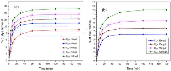 The influence of initial dye concentrations and contact time on dye adsorption kinetics by CC was explored using different initial dye concentrations: 15, 50, 75, and 100 mg/L. Figure 13 shows the sorption kinetics results for the various initial dye concentrations (C0) investigated.
