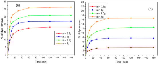 To evaluate the effect of adsorbent mass on the kinetics of dye adsorption, different masses (0.5, 1, 1.5, and 3 g) of the biosorbent (CC) were used. The objective was to optimize the quantity of adsorbent required to achieve maximum dye adsorption. The results are shown in Figure 14. The histogram shown in Figure 15 illustrates the effect of increasing biosorbent mass on the removal efficiency of BB-RS01 and BM-N5R dyes.