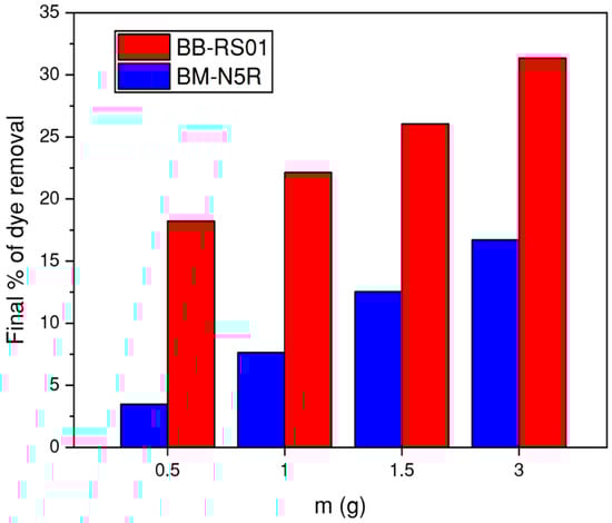 Histogram showing the effect of biosorbent mass on the removal efficiency of BB-RS01 and BM-N5R dyes.