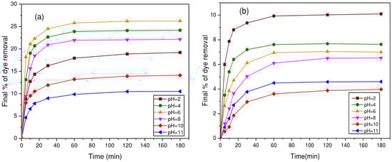 During the coagulation process, the pH of the solution plays a crucial role []. In this study, the effect of solution pH (ranging from 2 to 11) on dye removal was investigated using optimal doses of coagulant and flocculant. The optimal concentrations of coagulant and flocculent determined from previous experiments remained constant during the pH variations. The results are presented in Figure 12.