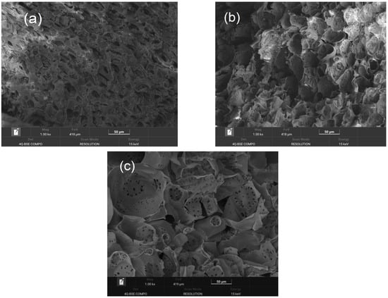 Thermogravimetric analysis (TGA) under a nitrogen atmosphere was used to evaluate the thermal stability of the samples in the temperature range of 50 to 700 °C, as shown in Figure 5. All the samples exhibited multistage degradation. A slight mass loss, attributed to the elimination of adsorbed water, was observed in all samples at approximately 50 to 150 °C. Three separate steps of mass decrease were identified. The early phase, occurring between 60 and 150 °C, was marked by the evaporation of bound water, which constituted around 6% of the bulk. The subsequent phase, ranging from 180 to 450 °C, was characterized by the thermal breakdown of the organic component (cellulose), resulting in an estimated mass loss of 73%. During this phase, the primary gaseous products evolved, including carbon dioxide (CO2), carbon monoxide (CO), methane (CH4), hydrogen (H2), and water vapor (H2O). These gases indicate the breakdown of cellulose’s polysaccharide structure through dehydration, decarboxylation, and depolymerization reactions []. The final phase, which occurs between 475 and 675 °C, corresponds to the carbonization process of the residual material, likely due to lignin decomposition, leading to a 17% mass loss. Lignin’s complex aromatic structure decomposes over a broader temperature range, releasing gaseous products such as CO2, CO, CH4, H2, and H2O. These emissions result from the cleavage of methoxyl, methyl, and methylene groups, as well as the breakdown of aromatic rings within the lignin polymer [,]. Similar remarks have been reported in previous studies on the adsorption of textile dyes by biomaterials [,,,,].