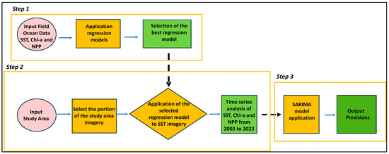 The analytical workflow can be divided into three main steps. In the first step, a regression algorithm was developed using sea water temperature, Chl-a concentration and NPP data. In the second step, this algorithm was applied to sea surface temperature (SST) imagery for generating time series data for Chl-a and NPP. Finally, in the third step, the SST, Chl-a and NPP time series were projected into the future to forecast potential variations (Figure 2).