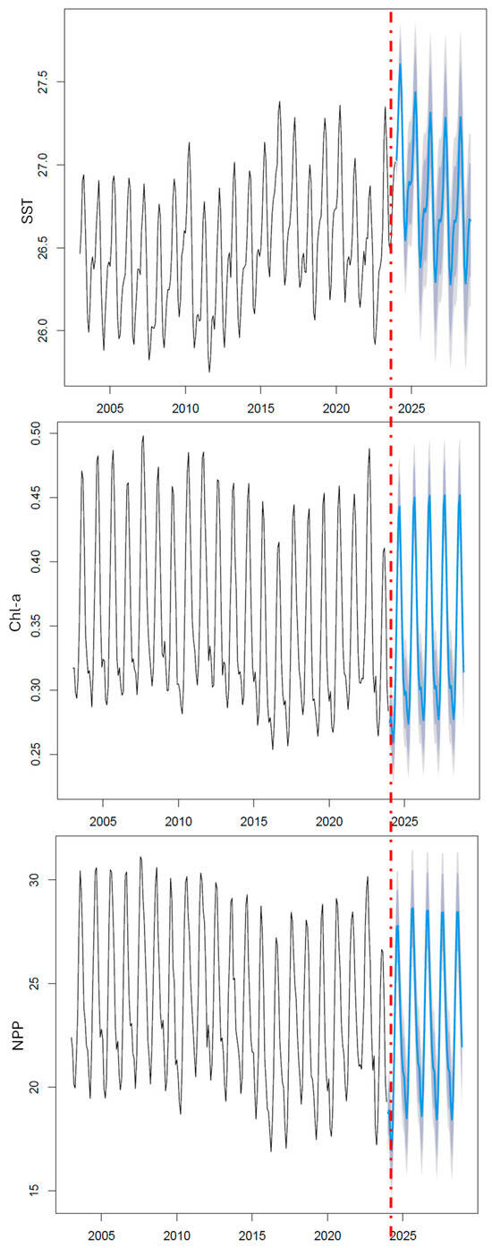 The results of the SARIMA prediction model applied to the SST, Chl-a and NPP time series, where the red line represents the start of new scenarios. The blue line after 2023 represents the estimated value, while the gray line represents the maximum and minimum confidence intervals.