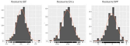 Distribution of the residuals for the SST, Chl-a and NPP time series analyzed with the SARIMA model.
