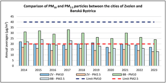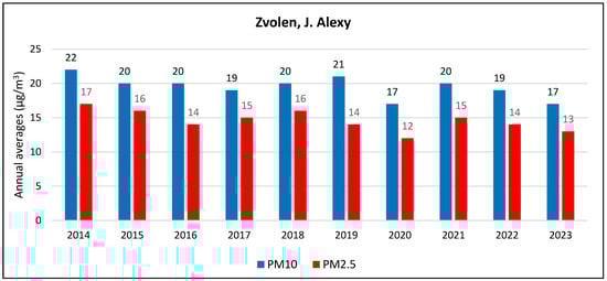 Concentrations of PM10 and PM2.5 measured at the J. Alexy monitoring station in Zvolen during the period 2014–2023 [8].