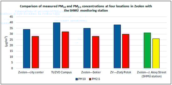 The obtained data were compared with the results from the reference monitoring station of the Slovak Hydrometeorological Institute (SHMÚ) located on J. Alexy Street in the southern part of the city. The comparison was conducted for the same time period, effectively eliminating seasonal effects and allowing for the evaluation of the influence of local pollution sources and prevailing wind patterns.