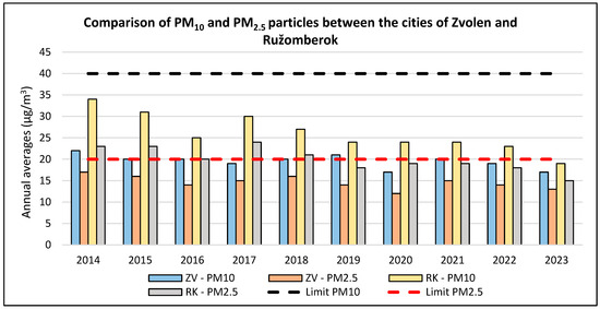 Comparison of PM10 and PM2.5 particles between the cities of Zvolen and Ružomberok based on SHMÚ data [7]. ZV—Zvolen. RK—Ružomberok.